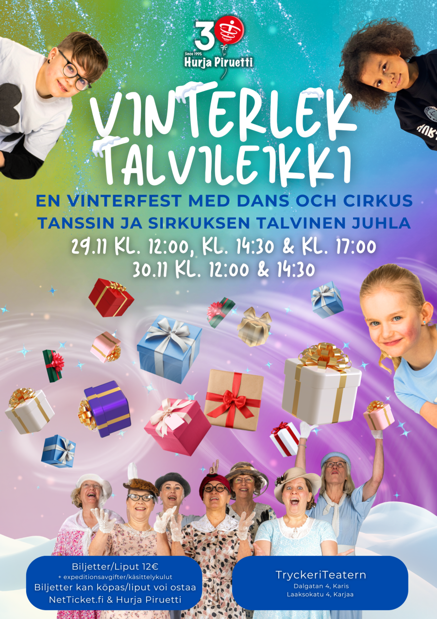 Hurja Piruettis Vinterlekar samlar återigen områdets dansande och cirkusintresserade barn, unga och vuxna för att fira höstterminens avslutning. Det väntar en varm och stämningsfull helg med mångsidiga uppträdanden, glädje och rörelse – en fest för gemenskap och skaparglädje.